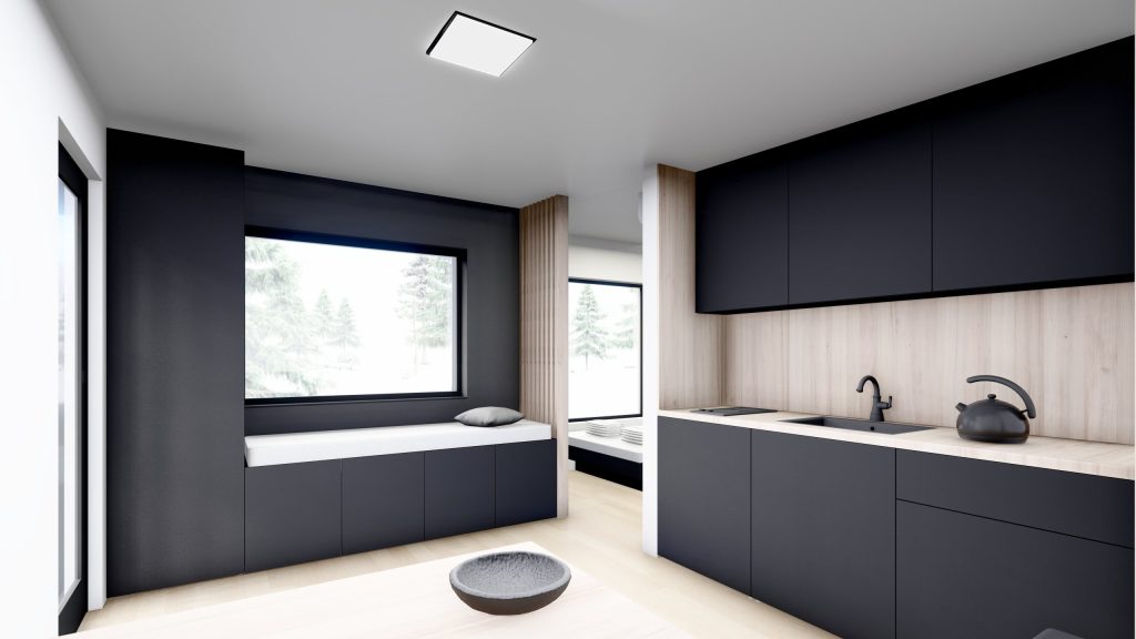 Casa Compact cu o compartimentare compusă dintr-un living cu bucătărie, dormitor, baie și terasă ce acoperă nevoile principale, oferă confortul deplin, indiferent că vorbim despre locuit, o casă de vacanță sau o afacere de tip turism.